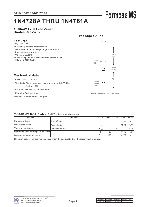 Axial Lead Zener Diode 1N4728A THRU 1N4761A Formosa MS 1000mW Axial Lead Zener Diodes - 3.3V-75V.