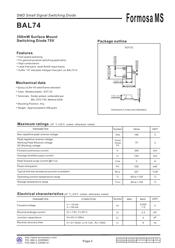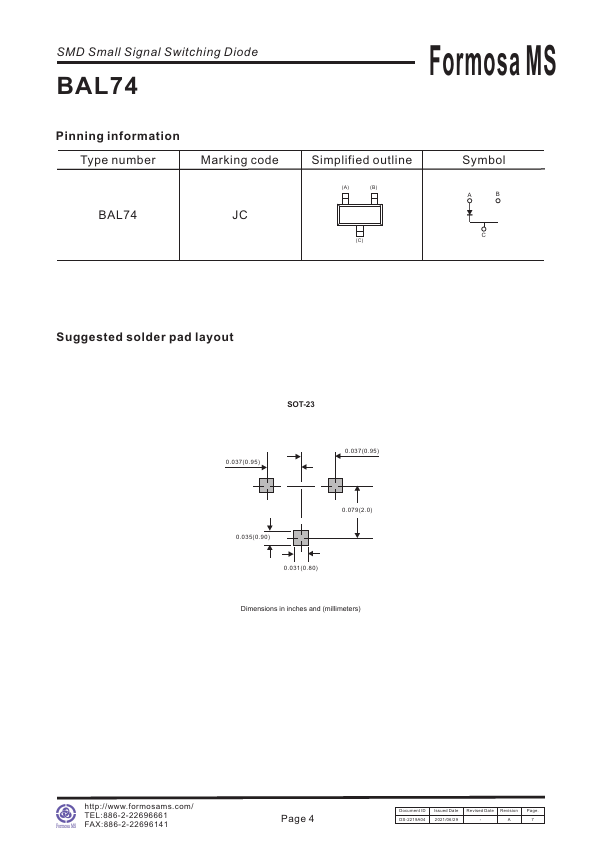 SMD Small Signal Switching Diode BAL74 350mW Surface Mount Switching Diode 75V.