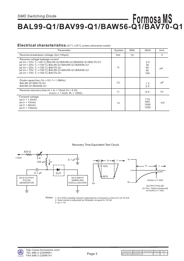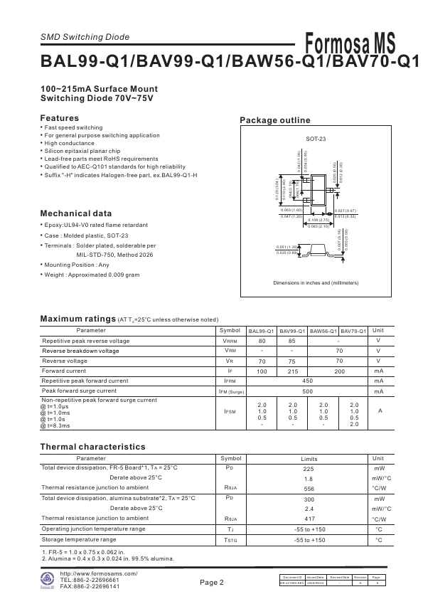 SMD Switching Diode Formosa MS BAL99-Q1/BAV99-Q1/BAW56-Q1/BAV70-Q1 100~215mA Surface Mount Switching Diode 70V~75V.