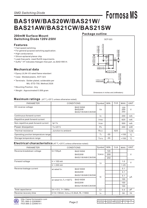SMD Switching Diode Formosa MS BAS19W/BAS20W/BAS21W/ BAS21AW/BAS21CW/BAS21SW 200mW Surface Mount Switching Diode 120V-250V Package outline SOT-323 0.016 (0.40) 0.008.