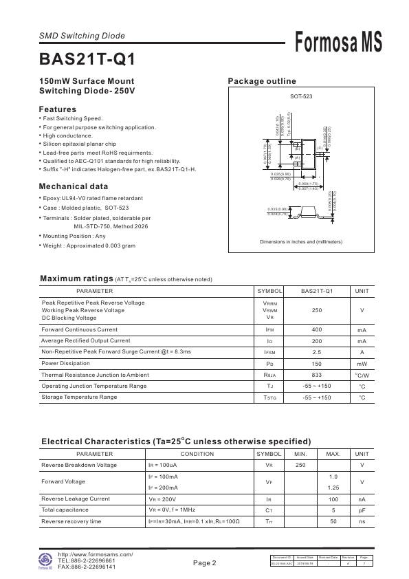 SMD Switching Diode BAS21T-Q1 150mW Surface Mount Switching Diode- 250V.