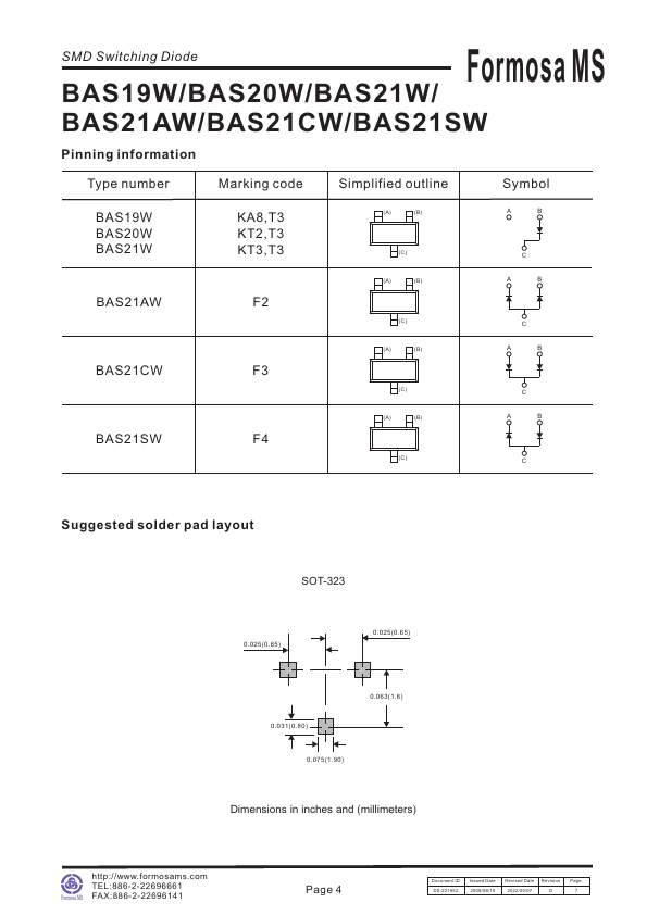SMD Switching Diode Formosa MS BAS19W/BAS20W/BAS21W/ BAS21AW/BAS21CW/BAS21SW 200mW Surface Mount Switching Diode 120V-250V Package outline SOT-323 0.016 (0.40) 0.008.