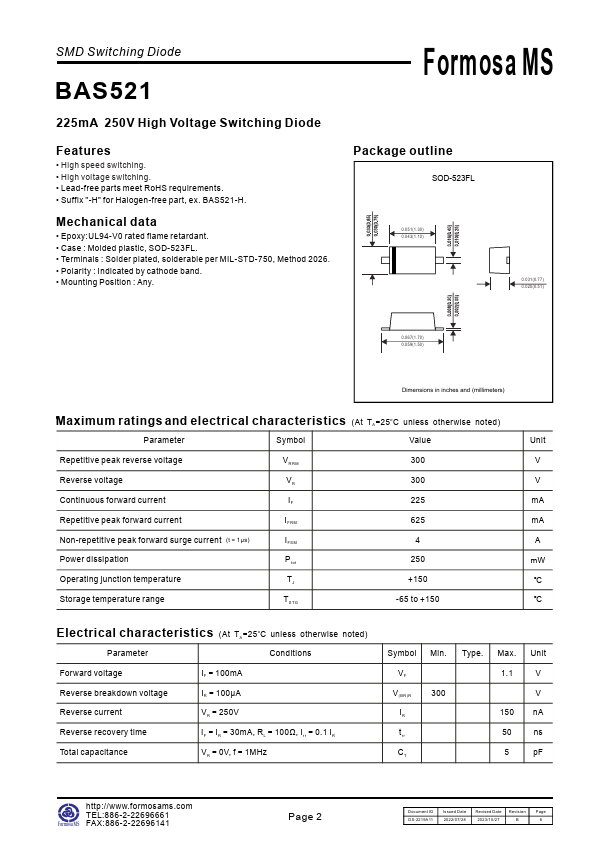 SMD Switching Diode BAS521 225mA 250V High Voltage Switching Diode.