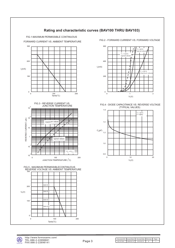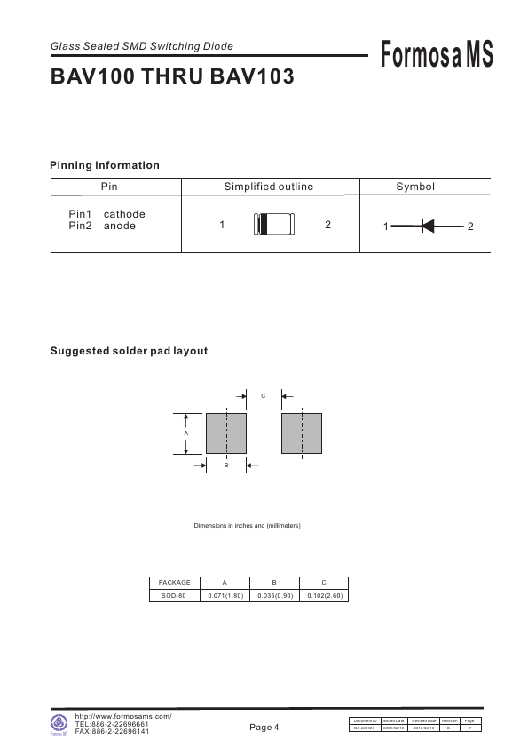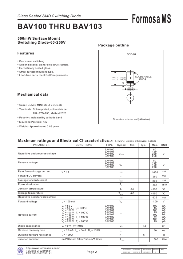 Glass Sealed SMD Switching Diode BAV100 THRU BAV103 Formosa MS 500mW Surface Mount Switching Diode-60-250V.