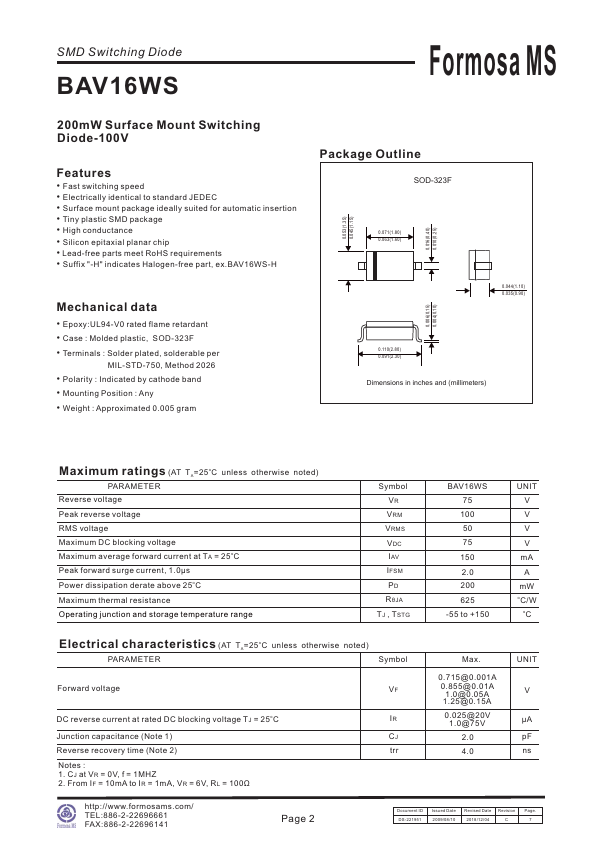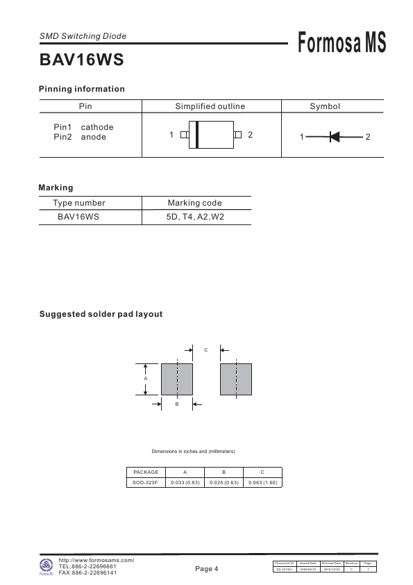 SMD Switching Diode BAV16WS Formosa MS 200mW Surface Mount Switching Diode-100V.