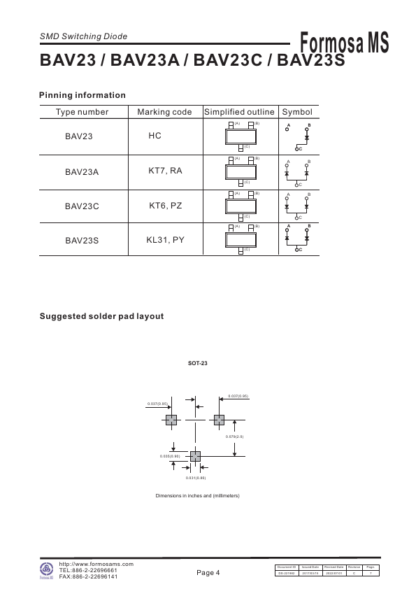 SMD Switching Diode Formosa MS BAV23 / BAV23A / BAV23C / BAV23S 225mA Surface Mount Switching Diode 200V.