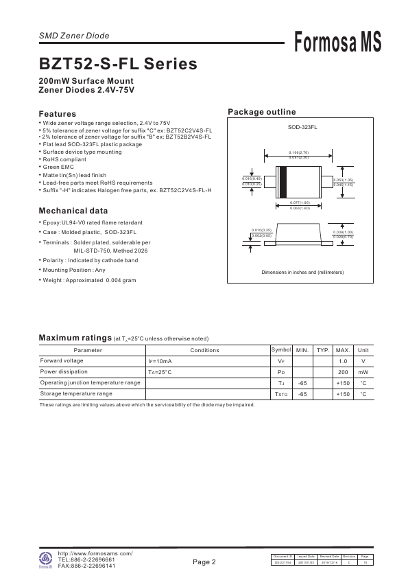 - 5% tolerance of zener voltage for suffix "C" ex: BZT52C2V4S-FL