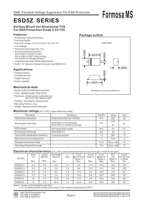 SMD Transient Voltage Suppressor For ESD Protection ESD5Z SERIES Formosa MS Surface Mount Uni-Directional TVS For ESD Protection Diode 2.5V-15V.