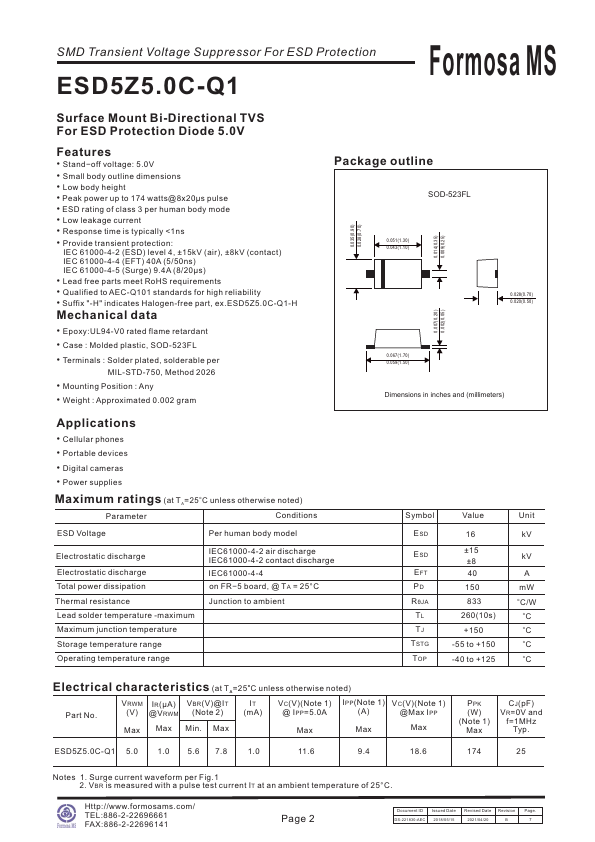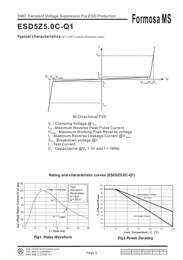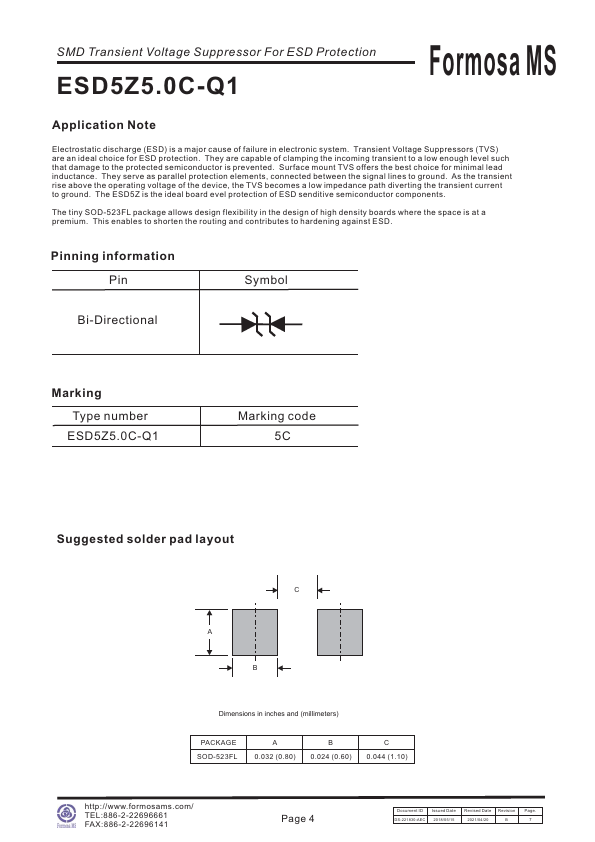 SMD Transient Voltage Suppressor For ESD Protection ESD5Z5.0C-Q1 Formosa MS Surface Mount Bi-Directional TVS For ESD Protection Diode 5.0V.