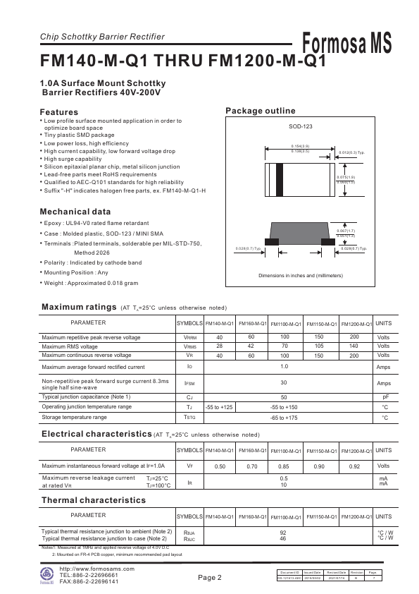 Chip Schottky Barrier Rectifier Formosa MS FM140-M-Q1 THRU FM1200-M-Q1 1.0A Surface Mount Schottky Barrier Rectifiers 40V-200V.