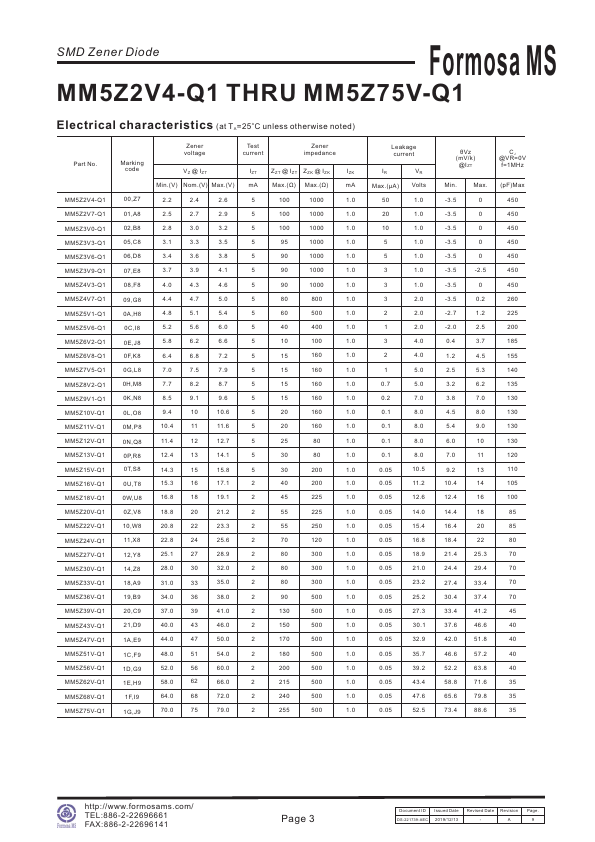 SMD Zener Diode Formosa MS MM5Z2V4-Q1 THRU MM5Z75V-Q1 200mW Surface Mount Zener Diodes.