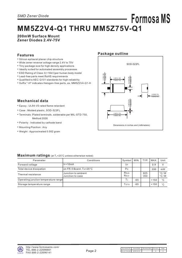 SMD Zener Diode Formosa MS MM5Z2V4-Q1 THRU MM5Z75V-Q1 200mW Surface Mount Zener Diodes.