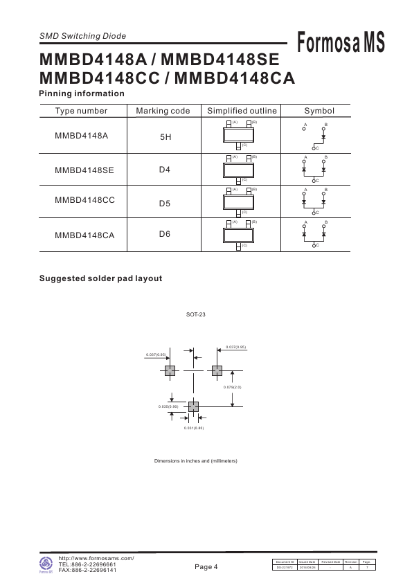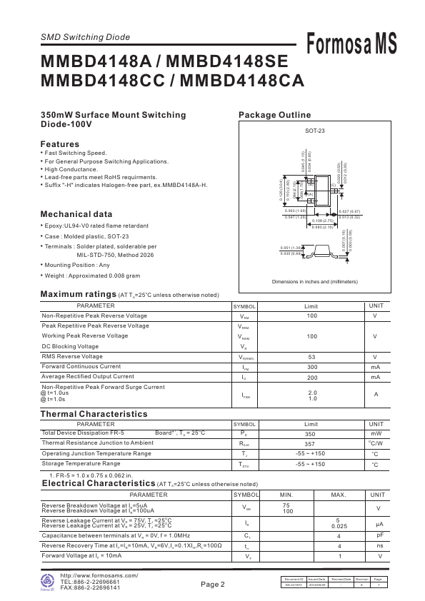 SMD Switching Diode Formosa MS MMBD4148A / MMBD4148SE MMBD4148CC / MMBD4148CA 350mW Surface Mount Switching Diode-100V.