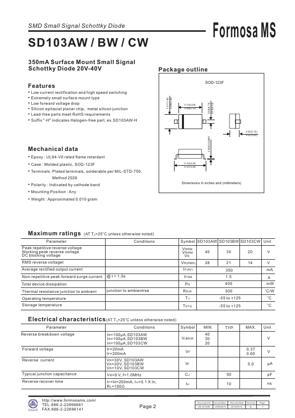 SMD Small Signal Schottky Diode SD103AW / BW / CW Formosa MS 350mA Surface Mount Small Signal Schottky Diode 20V-40V.