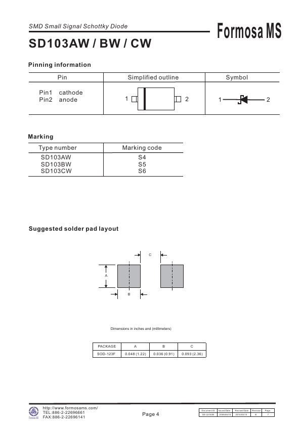 SMD Small Signal Schottky Diode SD103AW / BW / CW Formosa MS 350mA Surface Mount Small Signal Schottky Diode 20V-40V.