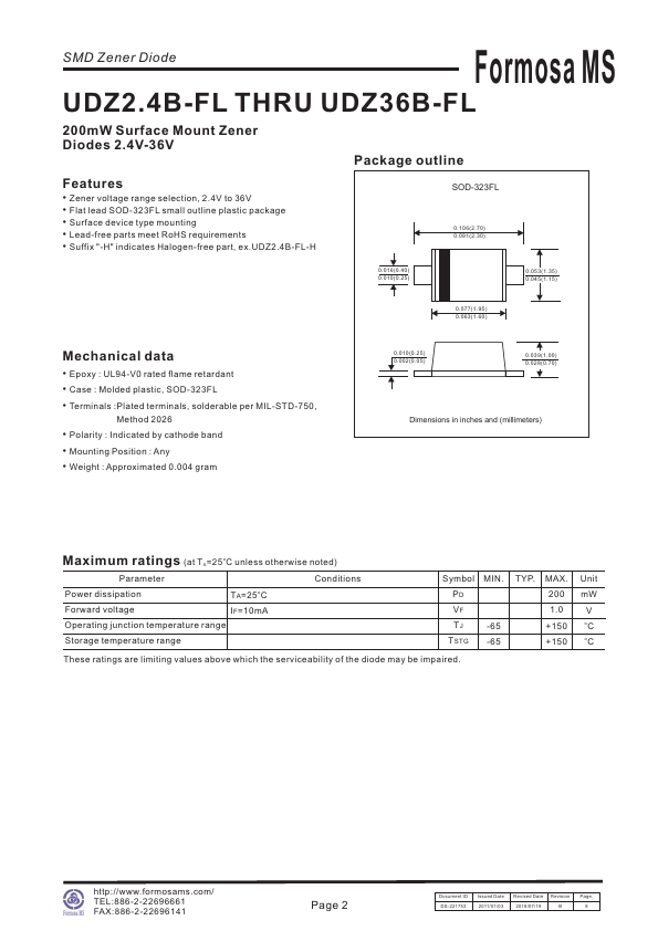 SMD Zener Diode Formosa MS UDZ2.4B-FL THRU UDZ36B-FL 200mW Surface Mount Zener Diodes 2.4V-36V Package outline.