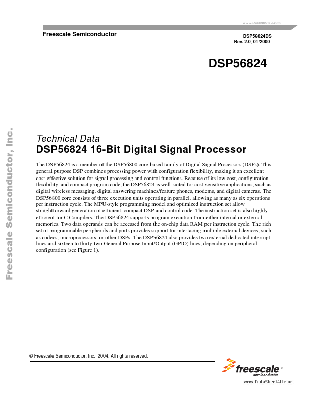 - All rights reserved. Freescale Semiconductor, Inc. Part 1 Overview 16 to 32 GPIO lines 4 8 8 4 4 6 2 PLL Programmable Interrupt GPIO GPIO Serial Periph. Interface (SPI0) or GPIO Serial Periph. Interface (SPI1) or GPIO Synch. Serial Interface (SSI) or GPIO Timer/ Event Counters or GPIO COP/ RTI Program Memory 32 K × 16 ROM 128 × 16 RAM Data Memory 3584 × 16 RAM Data Memory 2048 × 16 ROM Clock Gen. 16-bit DSP56800 Core Bit Manipulation Unit Address Generation Unit
