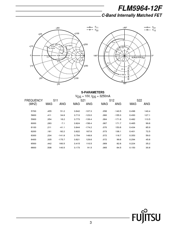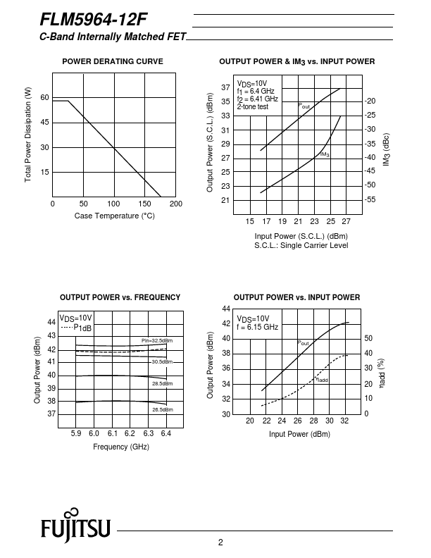 The FLM5964-12F is a power GaAs FET that is internally matched for standard munication bands to provide optimum power and gain in a 50 ohm system. Fujitsu’s stringent Quality Assurance Program assures the highest reliability and consistent performance. RATING (Ambient Temperature Ta=25¡C) Item Symbol Condition Rating Unit Drain-Source Voltage VDS 15 V Gate-Source Voltage VGS -5 V Total Power Dissipation PT Tc = 25¡C...