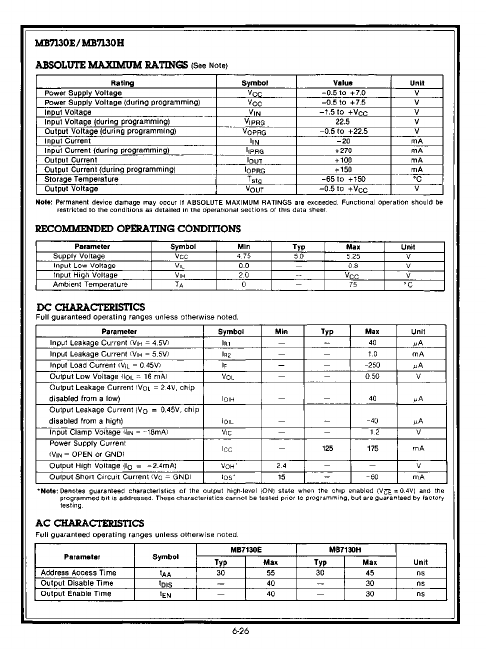The Fujitsu MB7130 is a high speed Schottky TIL electrically field programmable read only memory organized as 1024 words by 8-bits.