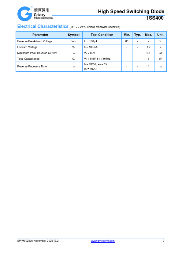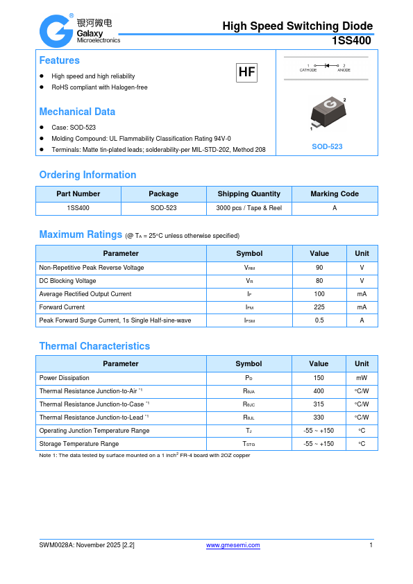 Features High speed and high reliability RoHS pliant with Halogen-free High Speed Switching Diode 1SS400 Case: UL Flammability Classification Rating 94V-0 Terminals: November 2025 [2.2] .gmesemi.