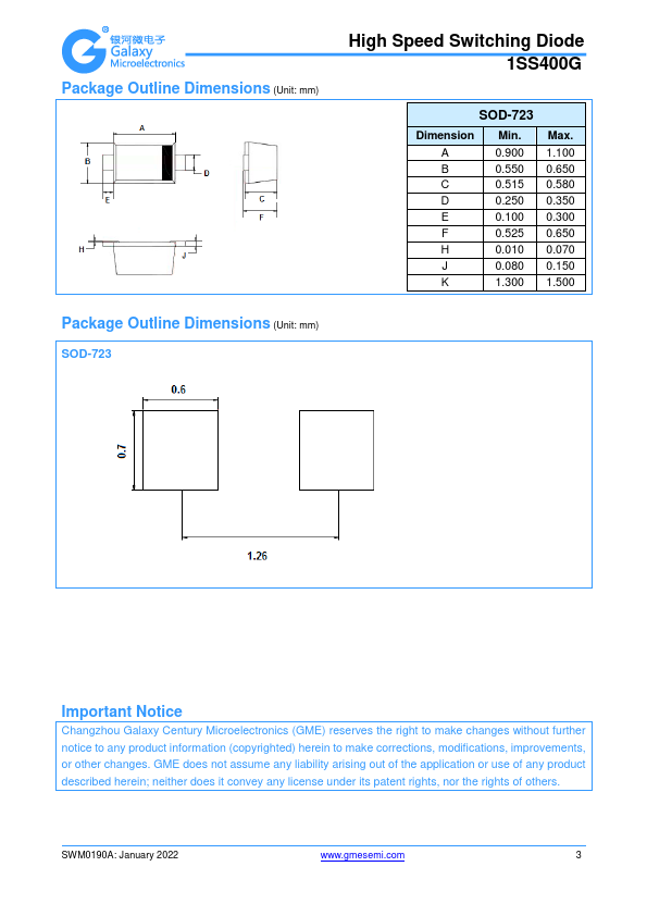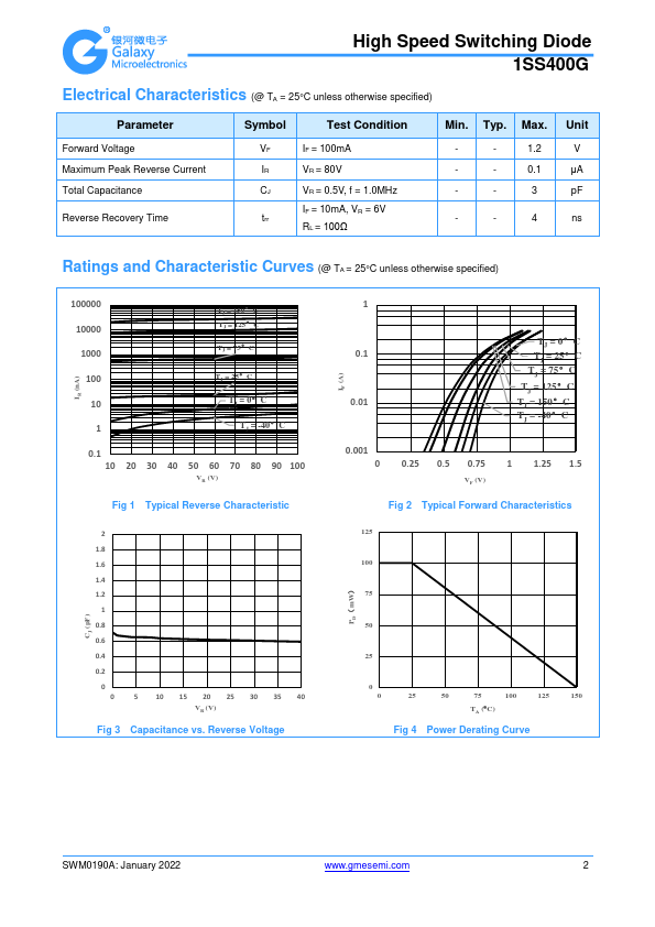 Features High speed and high reliability High Speed Switching Diode 1SS400G Case: UL Flammability Classification Rating 94V-0 Terminals: 2 Package Outline Dimensions (Unit:.