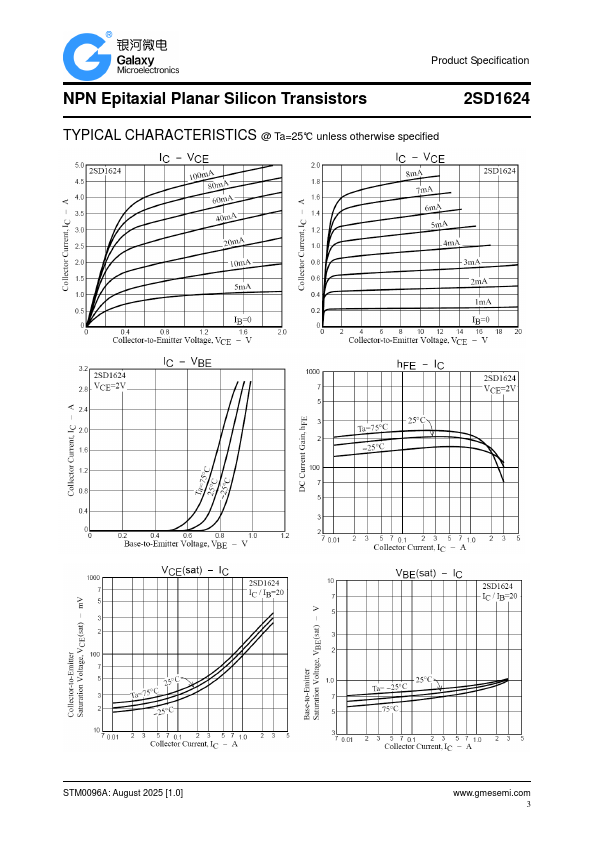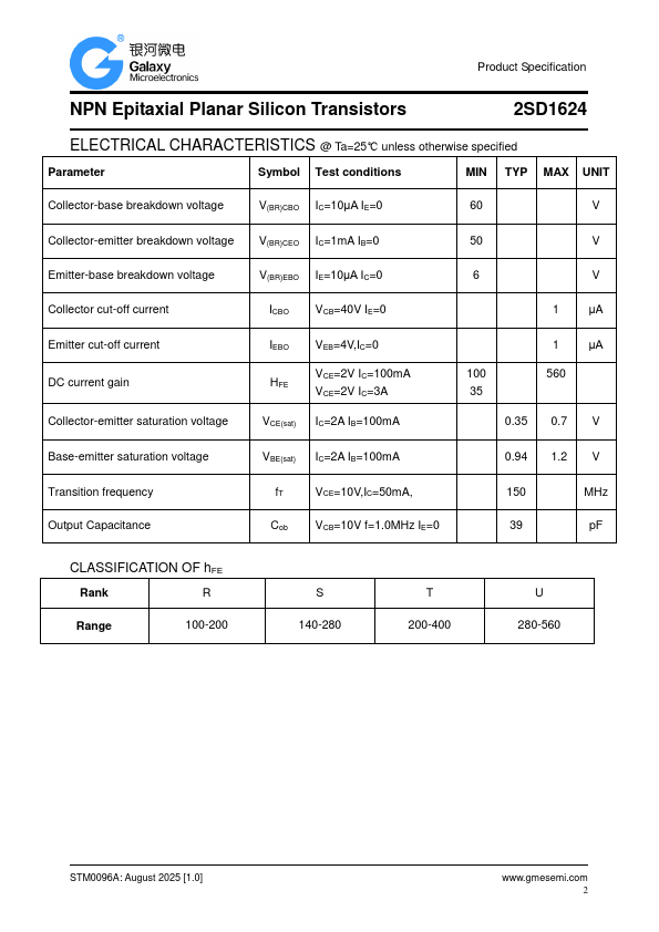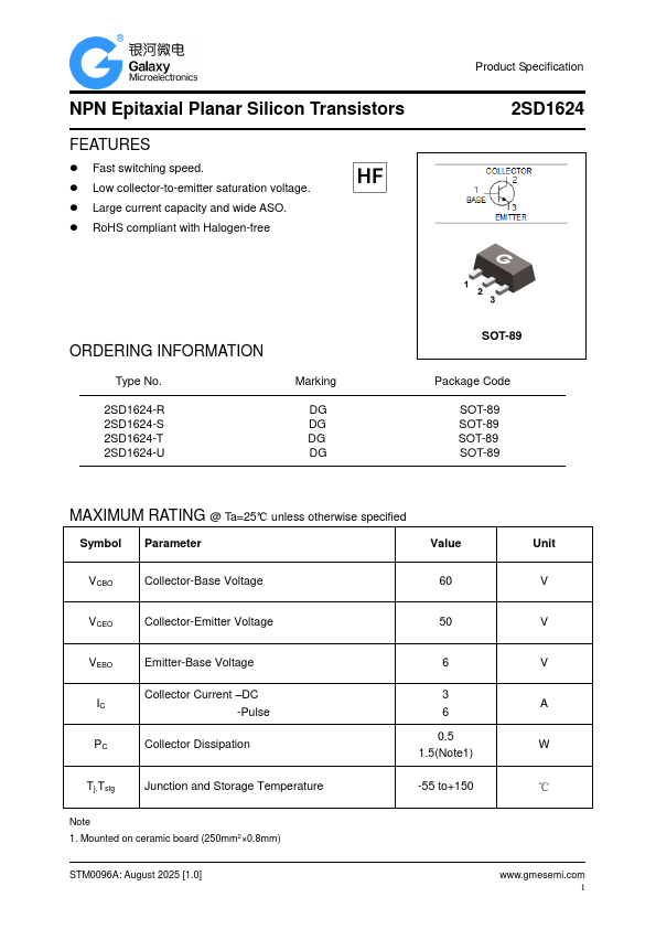 saturation voltage. Large current capacity and wide ASO. RoHS compliant with Halogen-free Product Specification 2SD1624 ORDERING INFORMATION Type No. 2SD1624-R 2SD1624-S 2SD1624-T 2SD1624-U Marking DG DG DG DG SOT-89 Package Code SOT-89 SOT-89 SOT-89 SOT-89 MAXIMUM RATING @ Ta=25℃ unless otherwise specified Symbol Parameter Value Unit VCBO Collector-Base Voltage 60 V VCEO Collector-Emitter Voltage 50 V VEBO IC PC Emitter-Base Voltage Collector Current –DC -Pulse Collector Dissipation Tj,Tstg Junction and Storage Temperature Note 1. Mounted on ceramic board (250mm2×0.8mm) 6 V 3 A 6 0.5 W 1.5(Note1) -55 to+150 ℃ STM0096