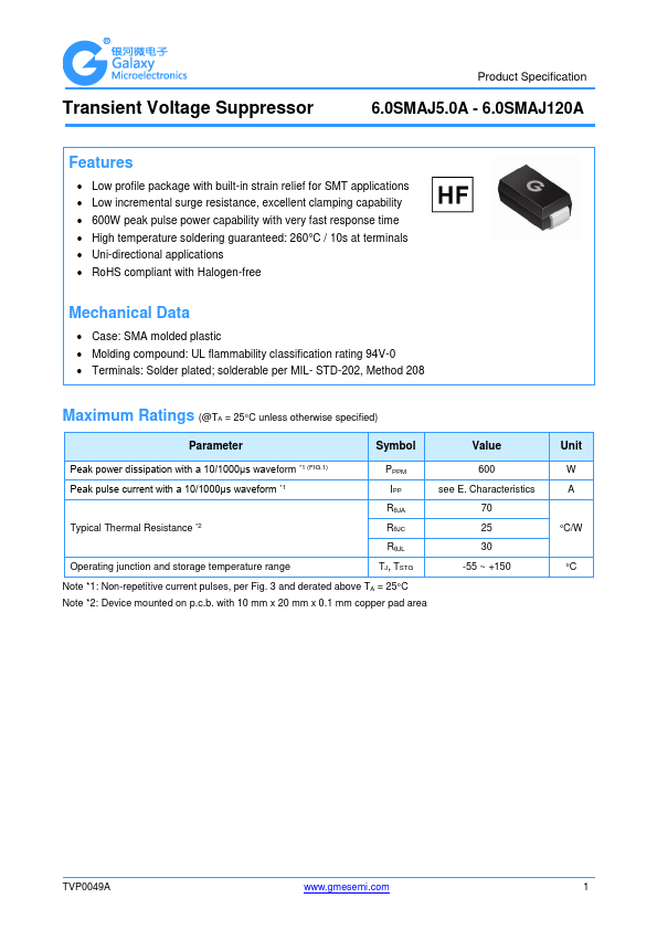 6.0SMAJ110A datasheet by Galaxy Microelectronics.
