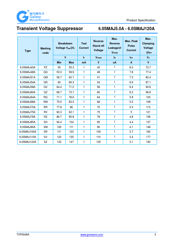 Transient Voltage Suppressor Product Specification 6.0SMAJ5.0A - 6.0SMAJ120A.