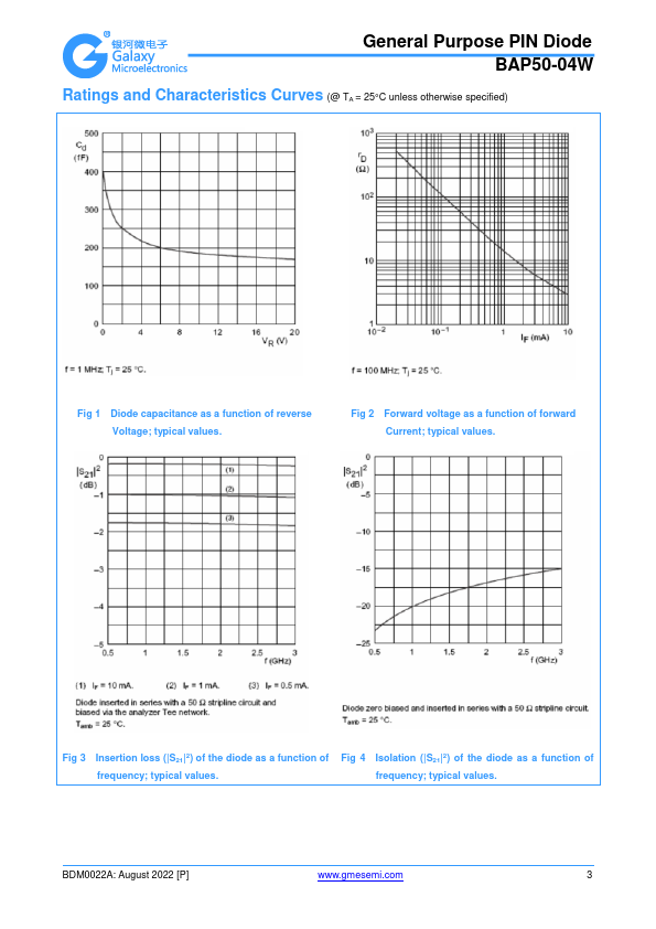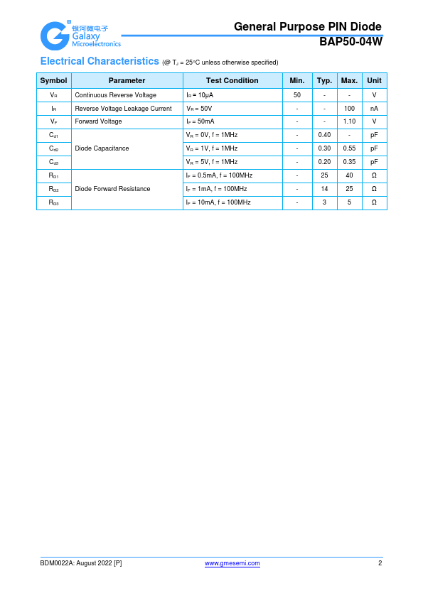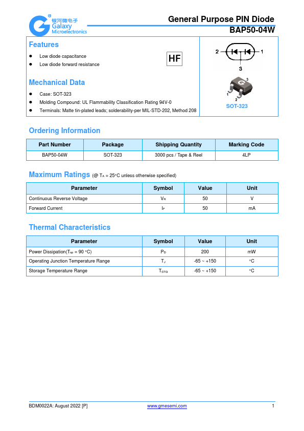 Features Low diode capacitance Low diode forward resistance General Purpose PIN Diode BAP50-04W Case: UL Flammability Classification Rating 94V-0 Terminals: August 2022 [P] .gmesemi.