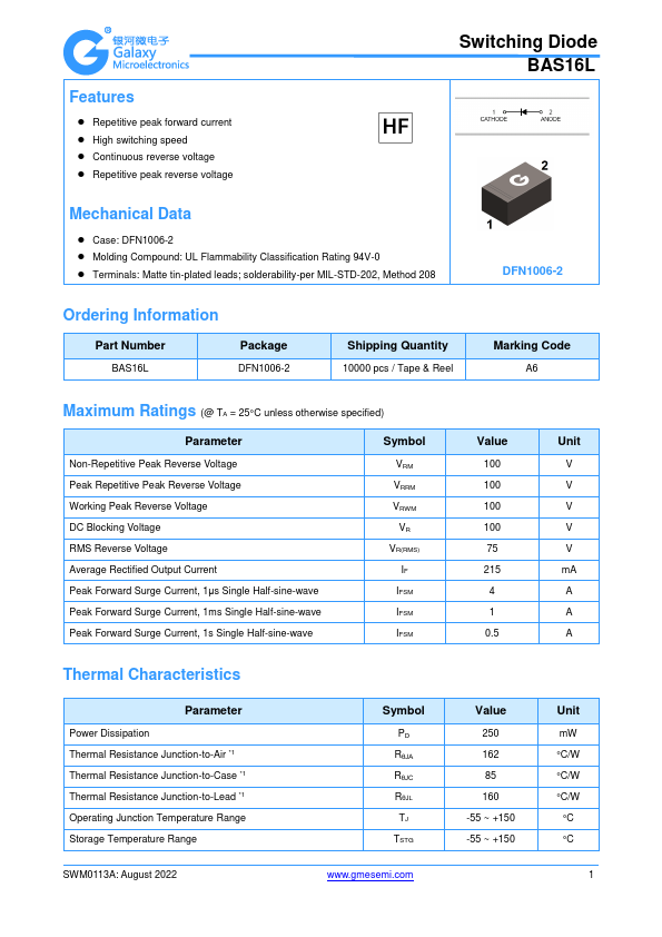 Case: DFN1006-2 Molding Compound: UL Flammability Classification Rating 94V-0 Terminals: Matte tin-plated leads; solderability-per MIL-STD-202, Method 208
