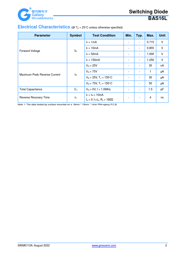 Non-Repetitive Peak Reverse Voltage Peak Repetitive Peak Reverse Voltage Working Peak Reverse Voltage DC Blocking Voltage RMS Reverse Voltage Average Rectified Output Current Peak Forward Surge Current, 1μs Single Half-sine-wave Peak Forward Surge Current, 1ms Single