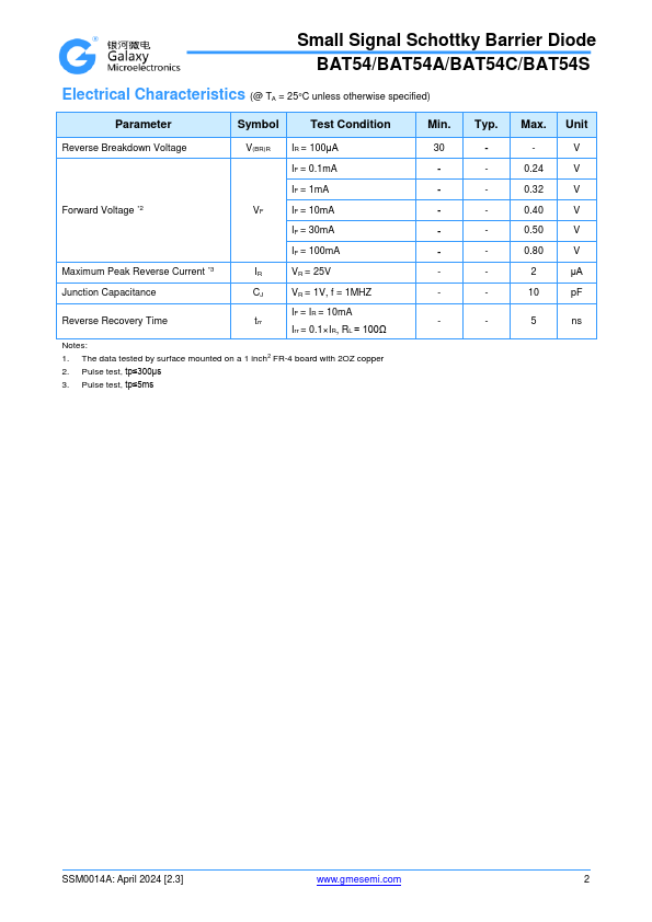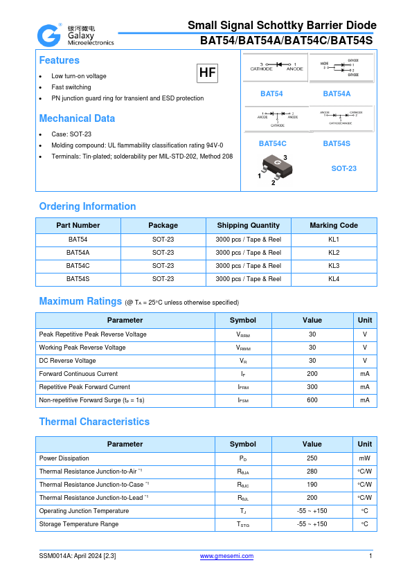 Small Signal Schottky Barrier Diode BAT54/BAT54A/BAT54C/BAT54S.