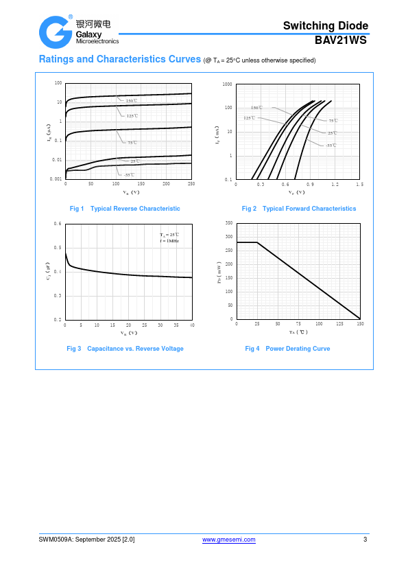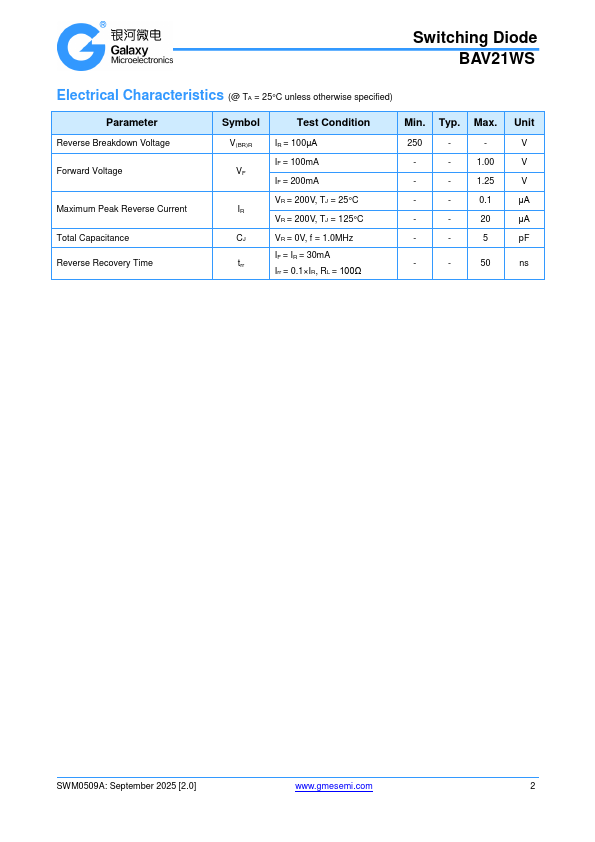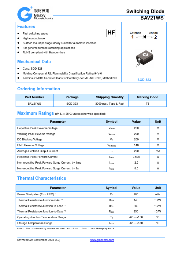 Features Fast switching speed High conductance Surface mount package ideally suited for automatic insertion For general purpose switching applications RoHS pliant with Halogen-free Switching Diode BAV21WS Case: UL Flammability Classification Rating 94V-0 Terminals: September 2025 [2.0] .gmesemi.