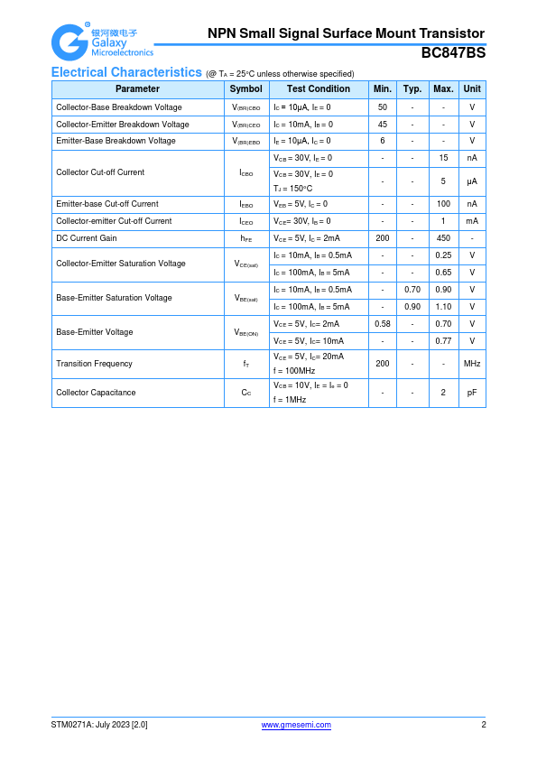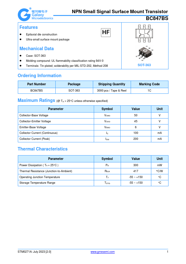 | BC847CW | NPN Small Signal Surface Mount Transistor |