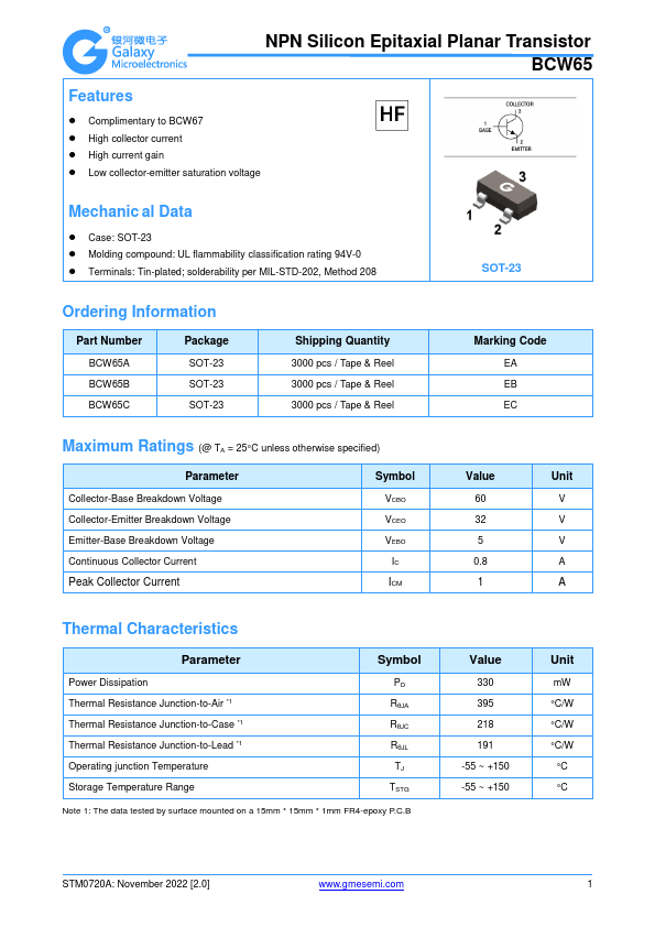 Overview: NPN Silicon Epitaxial Planar Transistor BCW65.