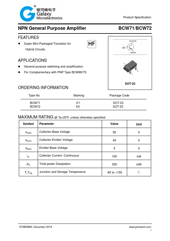 | BCW72 | NPN General Purpose Amplifier |
