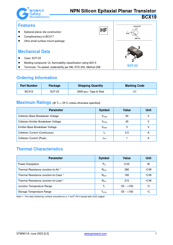 Overview: NPN Silicon Epitaxial Planar Transistor BCX19.