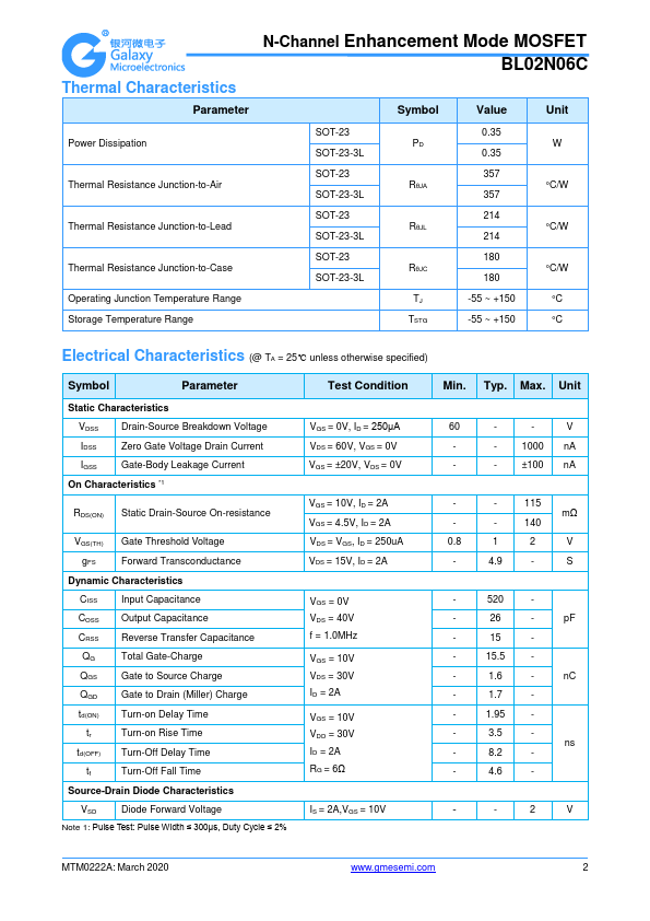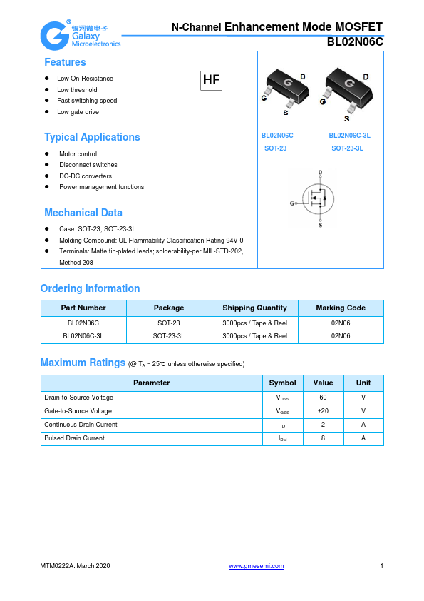 Features Low On-Resistance Low threshold Fast switching speed Low gate drive N-Channel Enhancement Mode MOSFET BL02N06C Typical Applications Motor control Disconnect switches DC-DC converters Power management functions BL02N06C SOT-23 BL02N06C-3L SOT-23-3L Case: SOT-23, SOT-23-3L Molding pound: UL Flammability Classification Rating 94V-0 Terminals:.