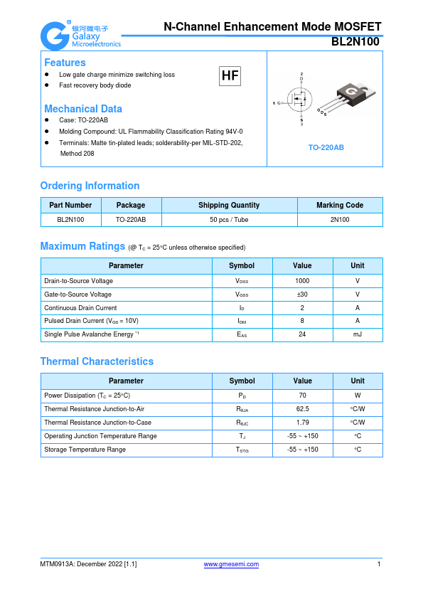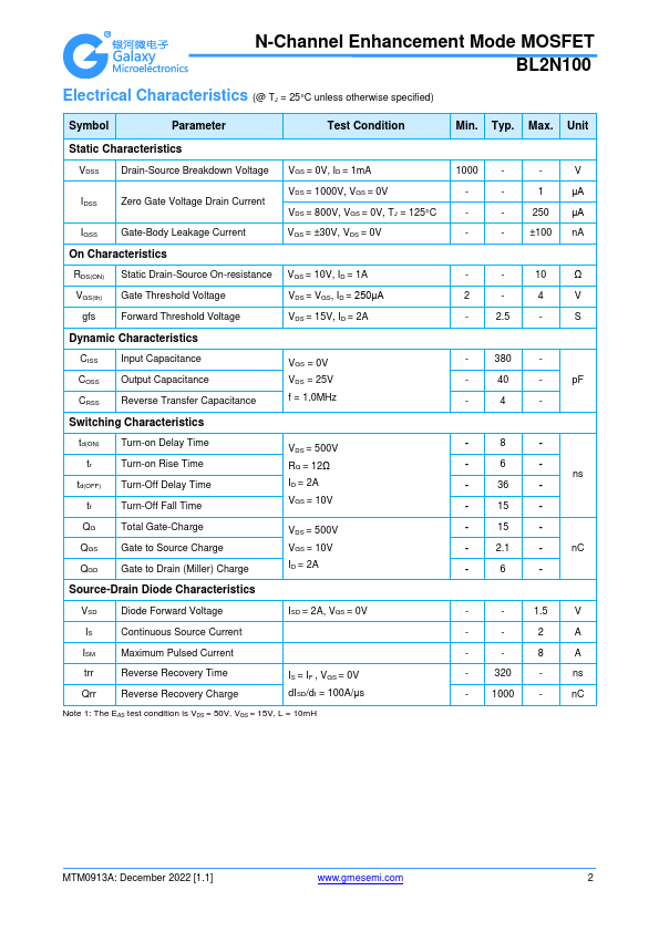 N-Channel Enhancement Mode MOSFET BL2N100.
