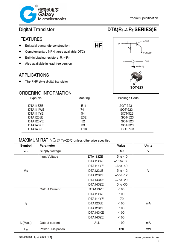 | MSV | DTA114WE | PNP Silicon Surface Mount Transistor | MSV |