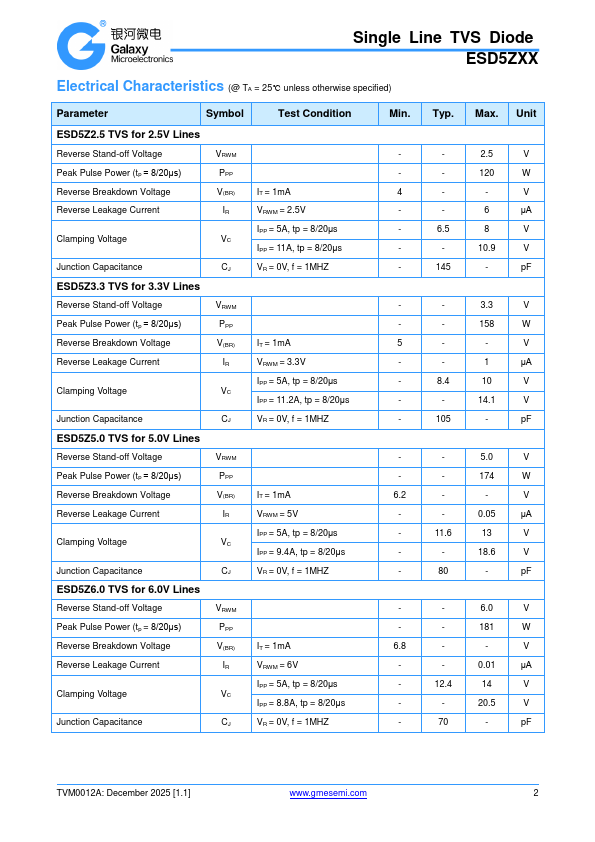 Features ESD / transient protection of high speed data lines IEC 61000-4-2 (ESD): ±30kV (air), ±30 kV (contact) Low reverse stand−off voltage: 2.5V-12V Very low leakage current RoHS pliant with Halogen-free Single Line TVS Diode ESD5ZXX Case:.