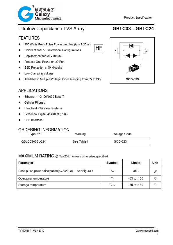 - 350 Watts Peak Pulse Power per Line (tp = 8/20μs)
