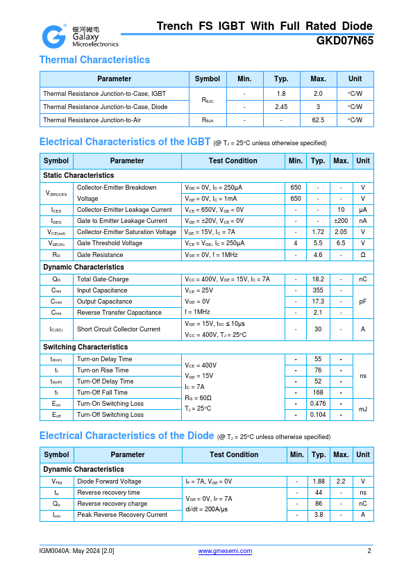 Trench FS IGBT With Full Rated Diode GKD07N65.