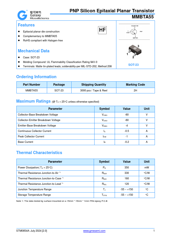 Features Epitaxial planar die construction plementary to MMBTA05 RoHS pliant with Halogen-free PNP Silicon Epitaxial Planar Transistor MMBTA55 Case: UL Flammability Classification Rating 94V-0 Terminals: July 2024 [2.0] .gmesemi.