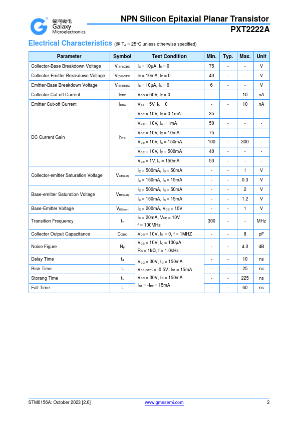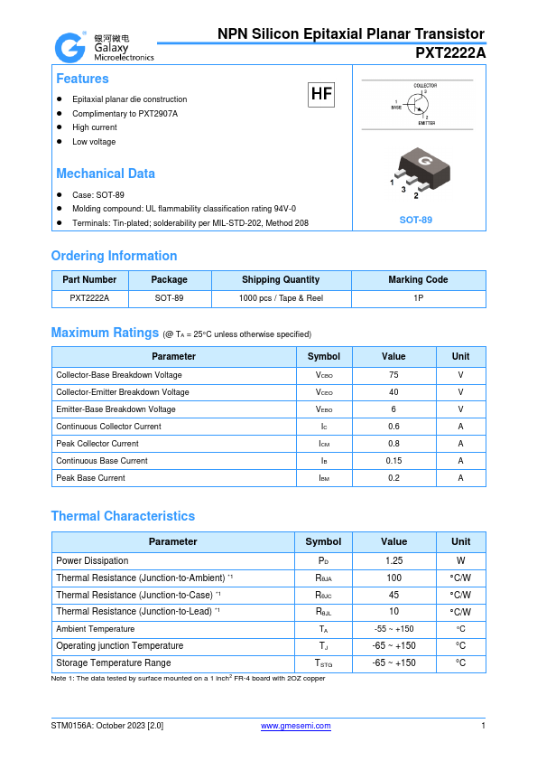 Features Epitaxial planar die construction plimentary to PXT2907A High current Low voltage NPN Silicon Epitaxial Planar Transistor PXT2222A Case: UL flammability classification rating 94V-0 Terminals: October 2023 [2.0] .gmesemi.