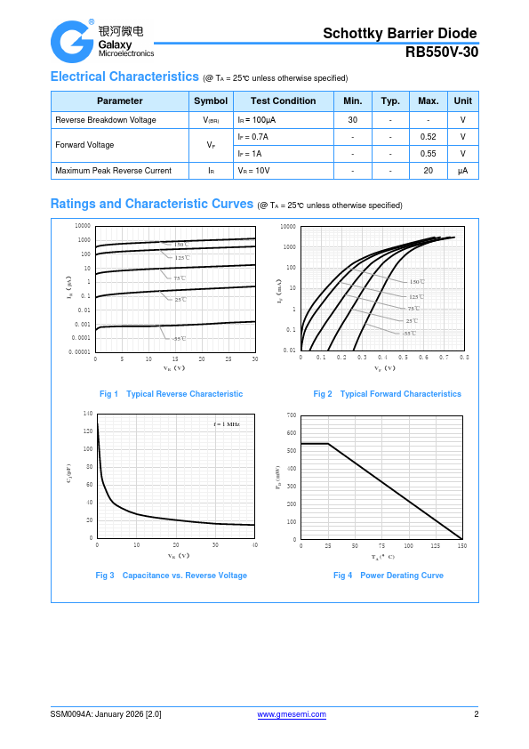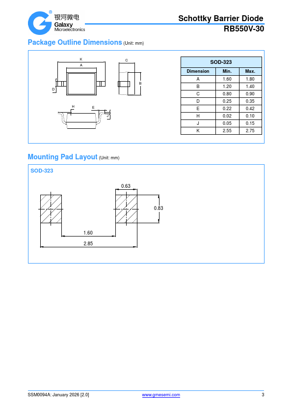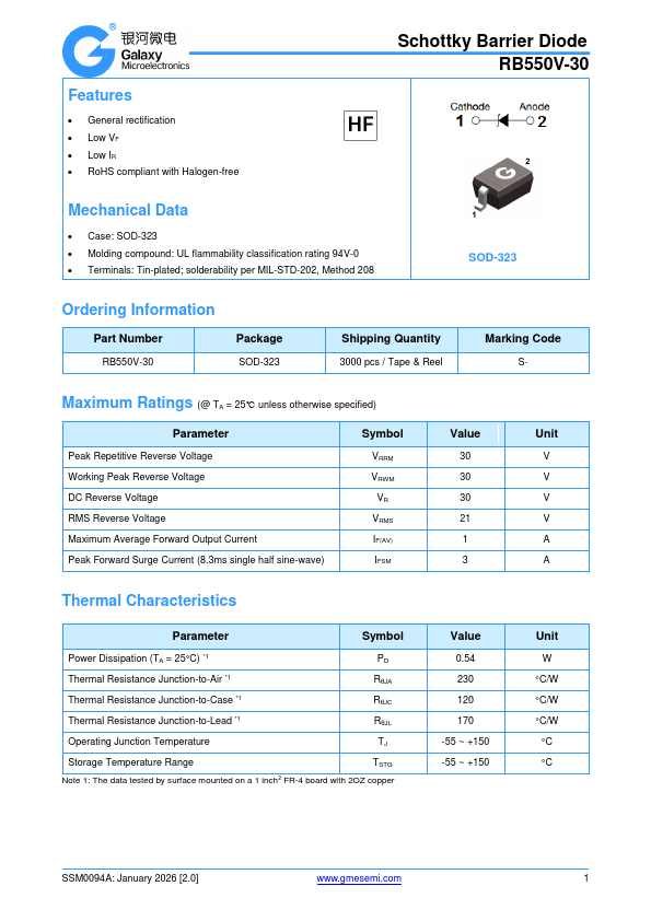 Features General rectification Low VF Low IR RoHS pliant with Halogen-free Schottky Barrier Diode RB550V-30 Case: UL flammability classification rating 94V-0 Terminals: January 2026 [2.0] .gmesemi.