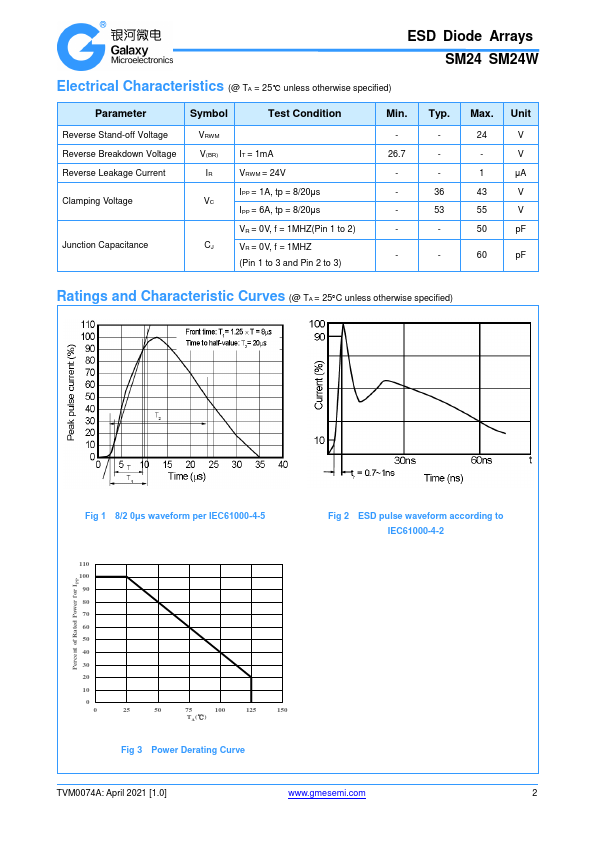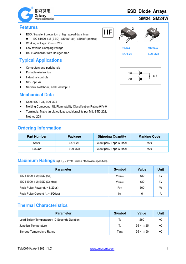 Features ESD / transient protection of high speed data lines IEC 61000-4-2 (ESD): ±30 kV (air), ±30 kV (contact) Working voltage: VRWM = 24V Low reverse clamping voltage RoHS pliant with Halogen-free Typical Applications puters and peripherals Portable electronics Industrial controls Set-Top Box Servers, Notebook, and Desktop PC Case:.