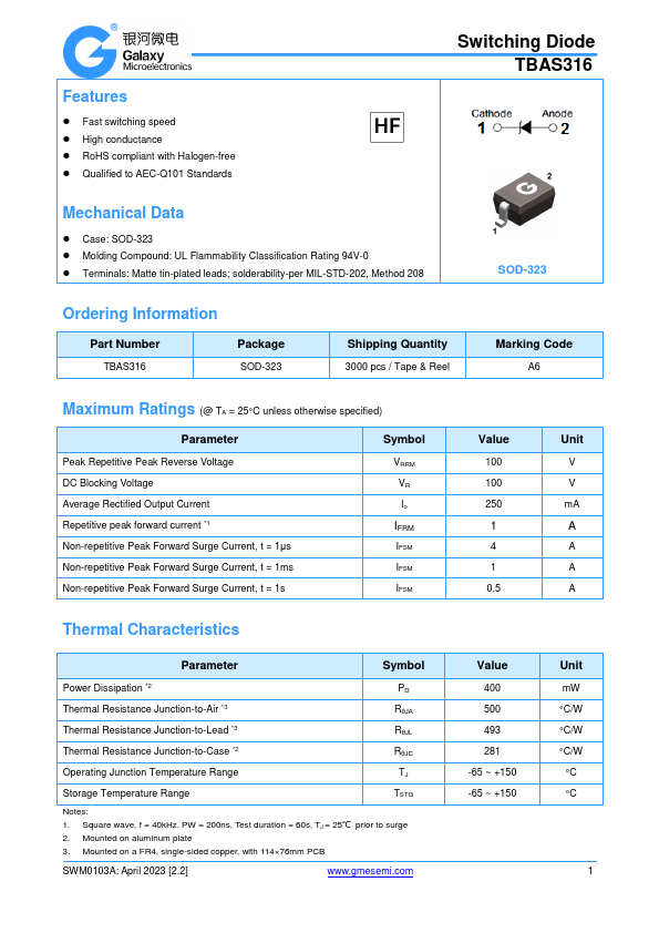 Fast switching speed High conductance RoHS compliant with Halogen-free Qualified to AEC-Q101 Standards