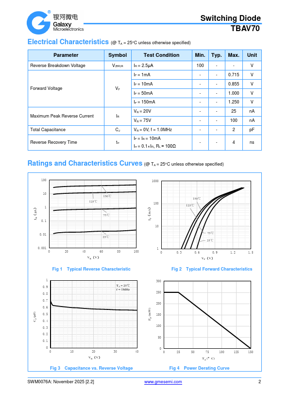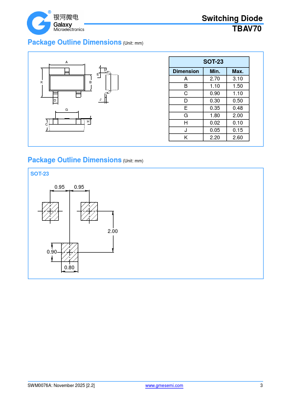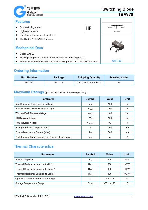 Features Fast switching speed High conductance RoHS pliant with Halogen-free Qualified to AEC-Q101 Standards Switching Diode TBAV70 Case: UL Flammability Classification Rating 94V-0 Terminals: November 2025 [2.2] .gmesemi.
