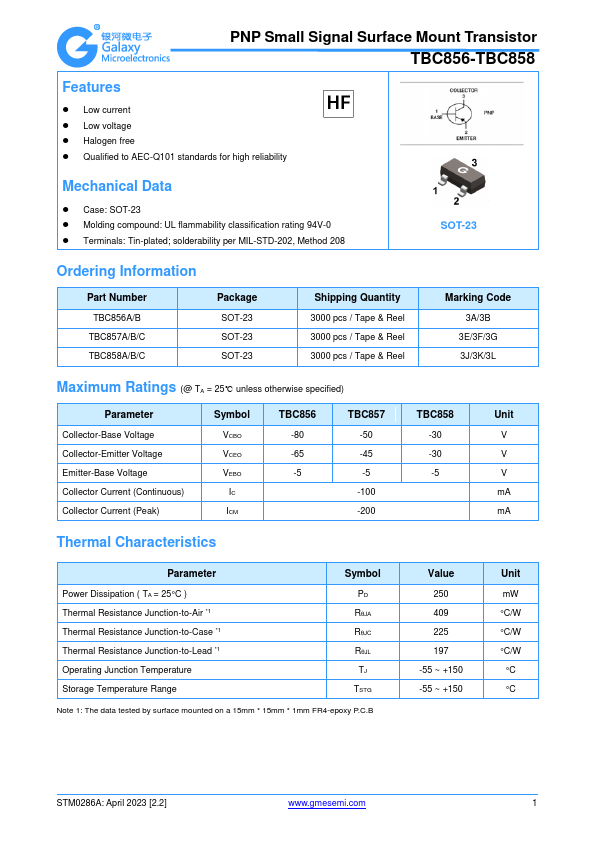 PNP Small Signal Surface Mount Transistor TBC856-TBC858.